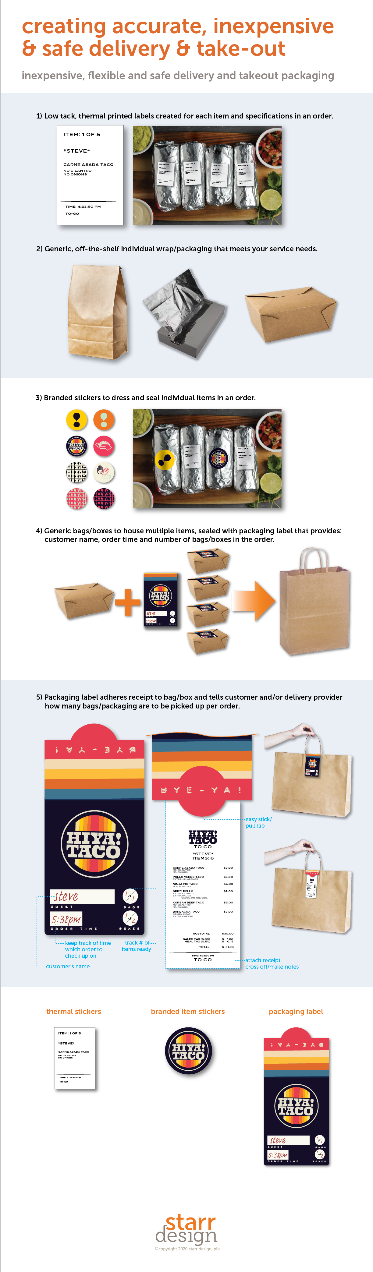 You want your takeout to look nice, allow your product to travel well and clearly communicate your brand, and you don’t have to spend thousands of dollars to do it. We recently worked with HIYA Taco, a new fusion taco concept out of Milwaukee, Wis., to implement this practical, inexpensive takeout and delivery model. The goal was to design something that reflects the taco shop’s That 70’s Show-inspired aesthetic while allowing the new concept to experiment and figure out what packaging best fits their menu items without having to invest in custom printed and produced packaging.